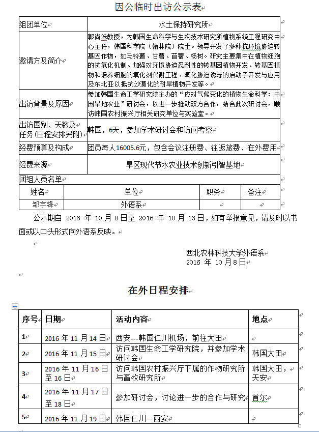 关于邹宇锋同志出国的公示