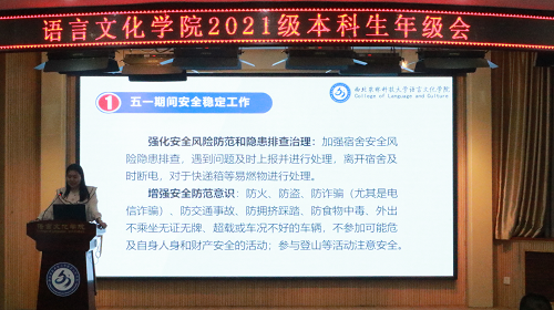 为了让同学们提高安全意识,重视自身的学业规划。2023年4月27日晚7点,语言文化学院2021级本科生年级大会在学院楼二楼报告厅顺利召开。本次会议由辅导员韩锐老师主持,21级全体本科生参加。