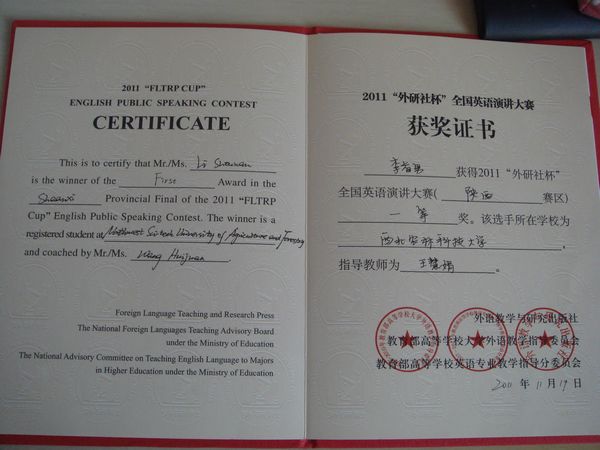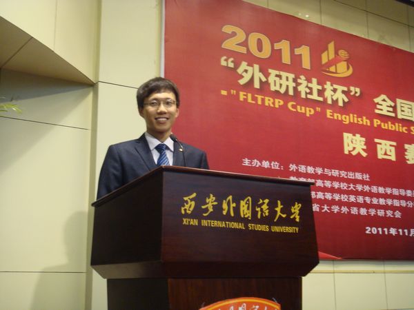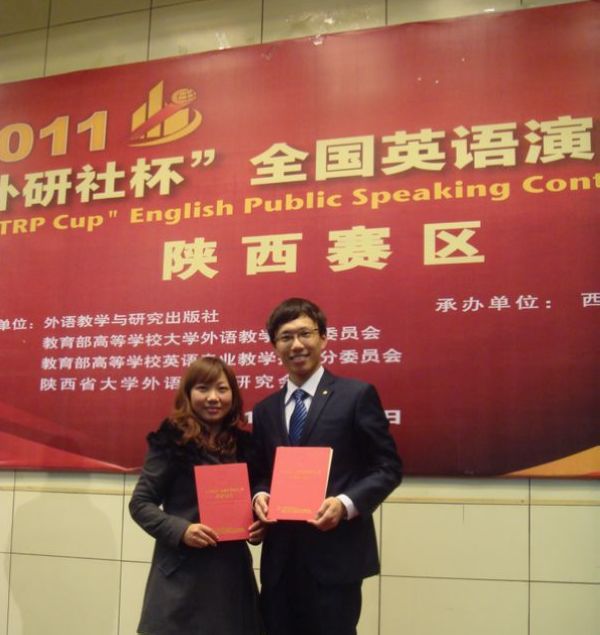 据悉,“外研社杯”全国英语演讲大赛作为一项全国性的英语演讲赛事,旨在为当代大学生搭建了一个激发英语学习兴趣、培养思辨能力、展示综合素质的高水平的平台,对培养选拔优秀人才、促进教学改革和创新发挥着重要作用,大赛自2002年迄今已成功举办十届。外语系李首男同学是我校英语演讲与辩论学会成员,自进入协会以来历经一年时间,在校演讲与辩论学会会长王慧娟老师的精心辅导下,按照国际与国内各种演讲与辩论模式进行刻苦训练,于2011年上半年取得了陕西省大学生英语演讲辩论赛二等奖的好成绩,下半年获得我校英语演讲比赛冠军,这次又获得陕西省省英语演讲决赛一等奖的不俗成绩,他的优秀表现为我校学子树立了很好的榜样。