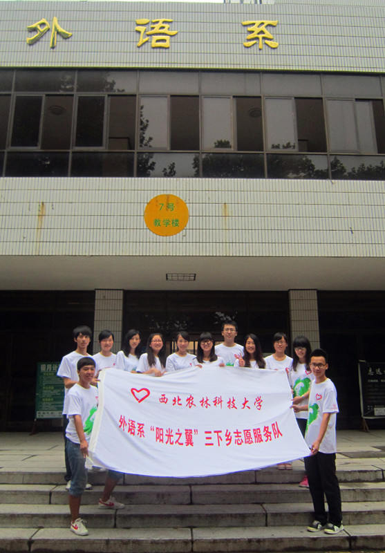 “用青春感染农民,用知识服务农村,关注留守儿童”, 我系为响应学校“走进社会、体验民情、学以致用”的三下乡活动主题,提高同学们学农、爱农、服务“三农”的本领,2012年7月8日早,邵龙老师及13名学生组成的“阳光之翼”暑期“三下乡”志愿者团队,将奔赴宝鸡市太白县鹦鸽镇柴胡山村,开展为期10天的社会实践活动。