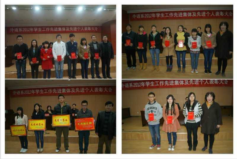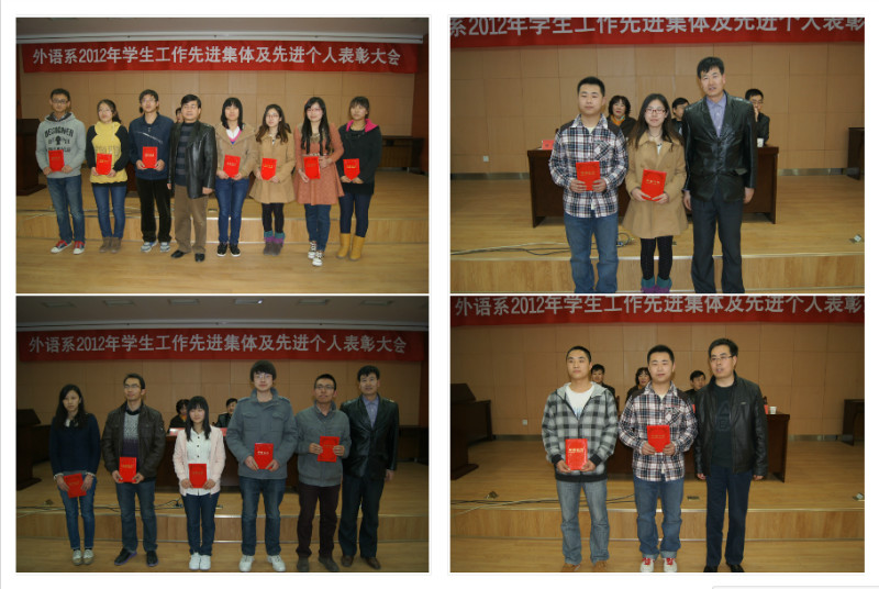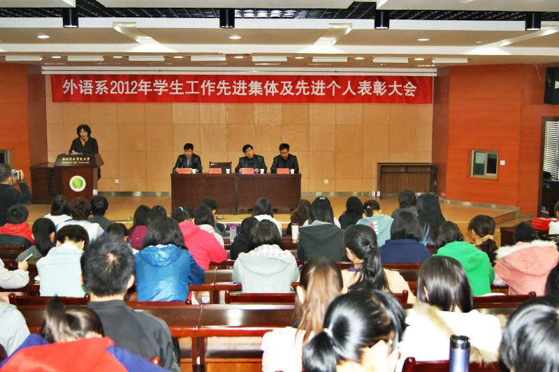 3月6日下午,我系2012年学生工作总结暨学生先进集体、先进个人表彰大会在北秀山南报告厅举行。系党委书记李安民、系主任窦琴、系党委副书记王小平出席会议。外语系副主任田志强主持大会。全体辅导员、班主任、受表彰的先进集体、先进个人代表和学生代表共100余人参加了表彰大会。