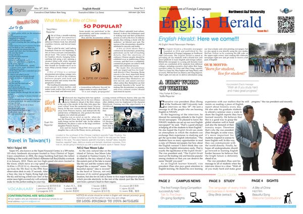 五月三十日由我校外语系主办的《英语学习导报》-English Herald正式创刊发行。该报纸依托外语系过硬的师资力量,借助外语系丰富的教学资源,以来自全校各个院系具备良好英语功底的英语爱好者担任编辑、记者,以学生为办报主体,在教务处、外语系领导及老师们的支持与指导下,发挥学生的主观能动性,以服务全校师生英语学习为宗旨,以丰富多样、轻松活泼、生动多彩的风格,向全校师生提供紧贴校情、紧贴师生、丰富实用的英语学习资讯。