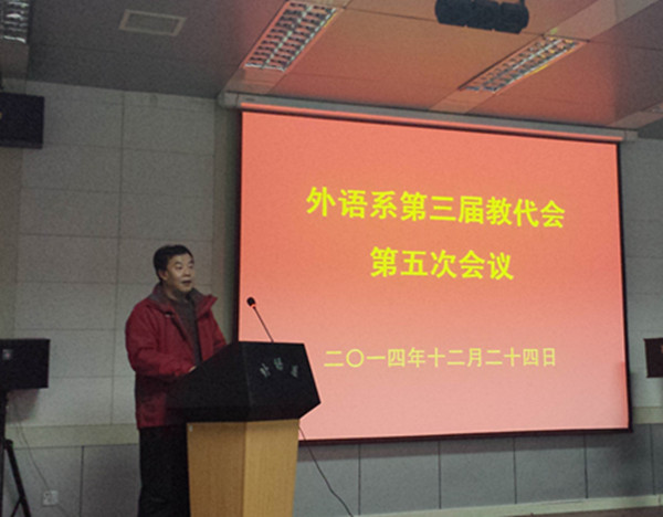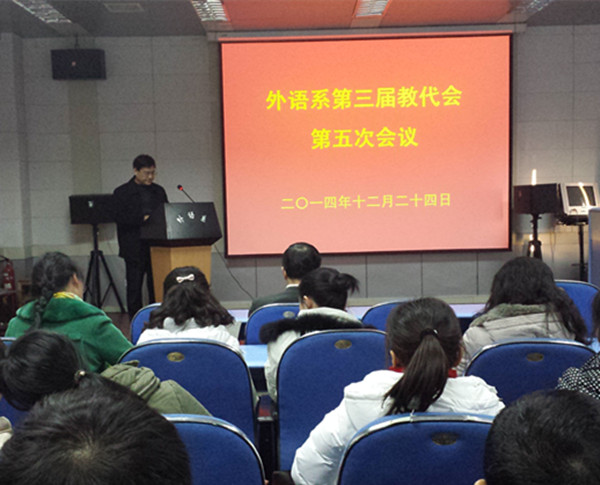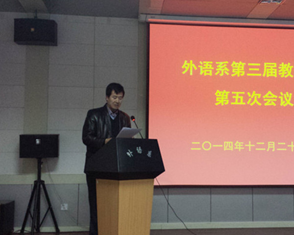 2014年12月24日下午16:00,外语系第三届教职工代表大会第五次会议在北校区七号楼7501教室隆重召开。校党委统战部秘书刘小峰代表学校出席会议。大会由系党委书记李安民同志主持。