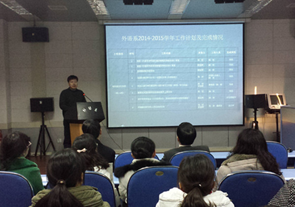 会上,系主任杨宏教授首先就外语系2014年总体工作及各项经费使用情况向与会代表作了详细汇报,接受代表审议。杨宏主任从学科建设、大学英语教学与改革、党建工作、学生工作、工会工作等方面对外语系一年来的工作进行了详细总结,对各项经费使用情况作了汇报,并对2015年的工作做了部署。