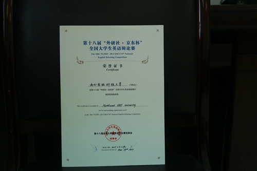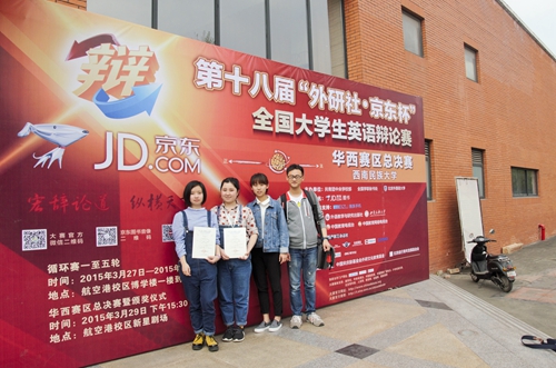 我校英文辩论队(NWAFU-EDT)于2014年开始进行全国大学生英语辩论赛校选赛,层层选拔最佳辩手,选配指导教师,精心培训指导,最终确定2011级英语专业杨丹妮和2014级英语专业梁松逸两名同学代表我校参加比赛。比赛中,我校代表队发挥出色,以良好的综合素质、扎实的英语基本功、灵活缜密的论辩技巧以及默契自如的配合取得优异成绩,获得大赛二等奖。