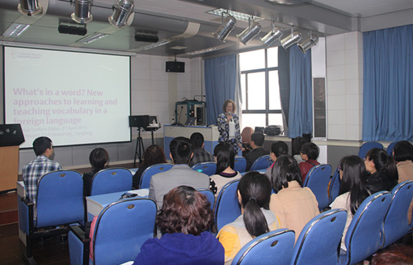 Jeanine Treffers-Daller教授以“The advantages of being bilingual or multilingual”和“New approaches to learning and teaching vocabulary in a foreign language”为主题分别与外语系师生进行座谈及学术交流。报告中她以二语习得语法和词汇孰轻孰重为切入点,提出词汇教学中方法策略的选择问题,特别强调了词汇教学要想方设法增加学生的参与度。同时,针对当下外语教学所关心的热点问题与广大师生展开了热烈讨论,鼓励大家积极探索词汇教学新方法,提高词汇教学的效率。