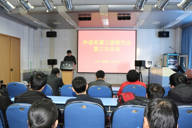 2014年1月3日下午4:00,外语系第三届教职工代表大会第三次会议在北校区七号楼7501教室隆重召开。校党委组织部秘书郑炜代表学校出席会议。大会由系党委副书记、工会主席王小平同志主持。