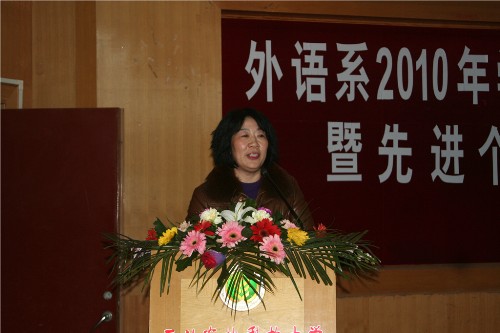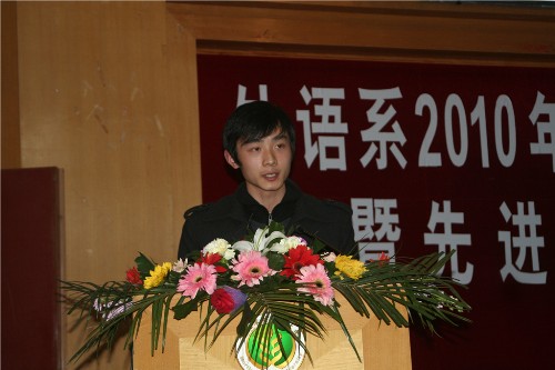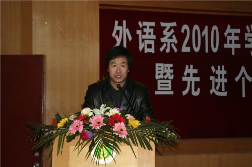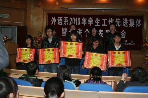 大会在庄严的国歌声中拉开序幕。会上,王小平副书记首先对2010年学生工作进行了详细而全面的总结,充分肯定了过去一年外语系学生工作取得的成绩,提出要继续办好“学长导航”、“英语演讲比赛”等我系的特色活动,并针对进一步加强学风建设、学生基础文明建设和纪律监督、大学生创新实践等问题提出了要求。随后,田志强副主任宣读了表彰决定。他指出,过去一年来,我系的学生工作取得了显著成绩,广大同学不断从自身做起,综合素质得到了培养和提高,在各类型、各级别的校内外竞赛中获得了优异成绩。在同学们热烈的掌声中,与会领导为获奖的先进集体和先进个人颁发了荣誉证书。