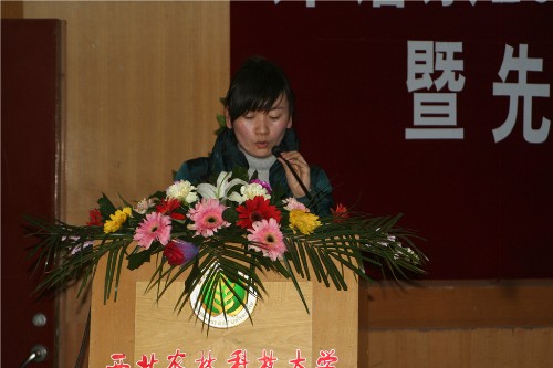 2010年“CCTV杯”全国英语演讲大赛全国优胜奖、“21世纪杯”英语演讲比赛陕西赛区特等奖获得者葛亮同学作为优秀学生代表发言,他说:“大学不仅是求知识,更是求人品,求思考,求能力,求上进。大学为每一个学子提供了一个成长的舞台,同学们要在这里寻找人生的方向,寻找最适合自己的那条路,因势利导,对自己负责,树立自己的人生观和价值观,最终实现自己的目标,度过一个让自己不后悔的四年。”