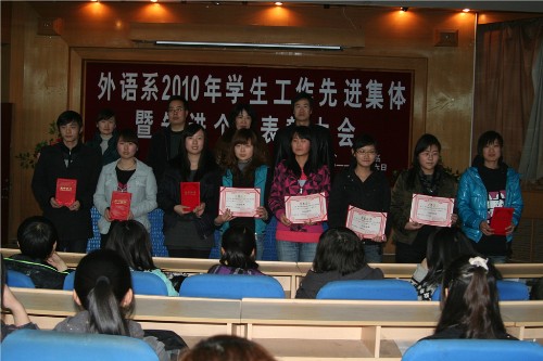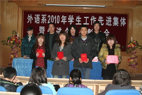 3月6日晚19:00,外语系2010年学生工作先进集体暨先进个人表彰大会在七号楼二层报告厅隆重举行。外语系系主任窦琴、党委副书记王小平、系副主任田志强、全体辅导员、及200余名学生参加了大会。表彰大会由辅导员路伟伟主持。