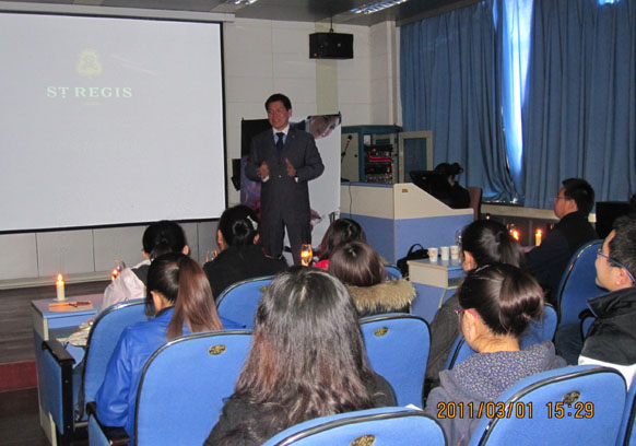 在为大家表演了酒店延续了155年的马刀开香槟庆典仪式之后,酒店的房务总监米歇尔郭先生为大家介绍了酒店的基本情况。拉萨瑞吉度假酒店是是西藏第一家国际奢华品牌五星级酒店,于2010年11月15日正式试营业。此次酒店前来我校欲招聘英语专业毕业生,从事酒店管理服务工作。宣讲会后,十几位同学参加了面试。