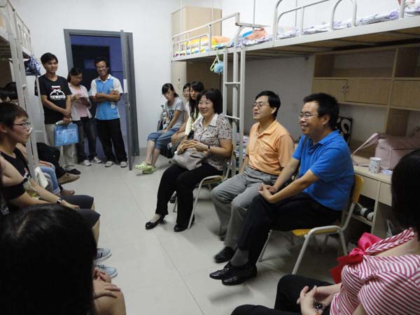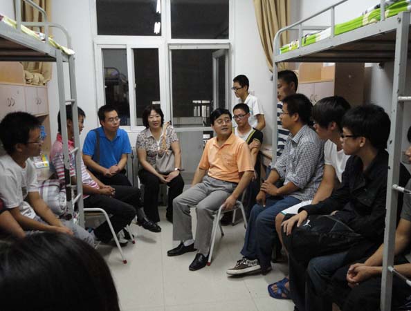 在学生宿舍,系领导与学生进行了亲切交谈,对新生嘘寒问暖,了解他们初到学校的感受并对他们提出的问题做出了细致的解答。窦主任说:“这个学校的文化底蕴深,要积极利用学校的资源,发挥特长。”并嘱咐学生要尽快调整好心态,适应新环境。李书记要求大家一切要早做准备,大学学习与高中不同,千万不可放松,要坚持不懈。王书记介绍了专业和学校相关的一些情况。领导们还强调要同学们要注意安全和饮食卫生,有事外出要向辅导员和班主任请假,若有问题要及时与老师联系。同学之间要团结,和睦相处。在与新生交谈中,领导们还积极鼓励学生,为学生适应大学生活树立信心。