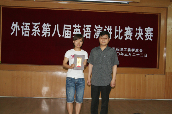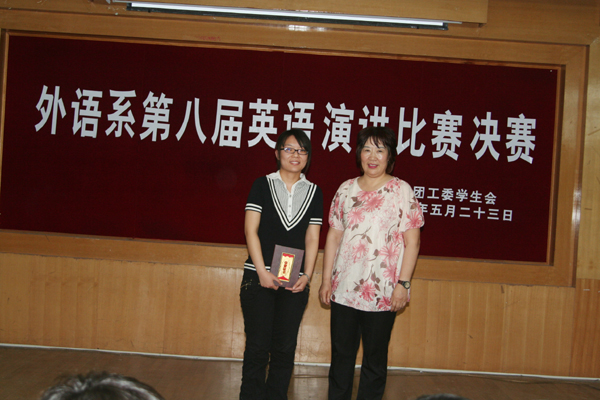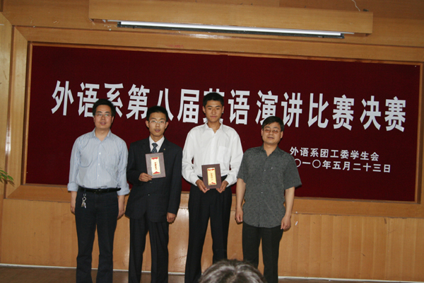 本次比赛以 “To serve not to be served” 为主题,比赛分为初赛和决赛两个阶段,参赛选手经过激烈角逐,最后有16名选手进入决赛。决赛分三个环节:命题演讲、即兴演讲和问答。进入决赛的16名学生,用流利的英文阐述了他们的观点。他们以标准的发音、适当的语速、饱满的感情、丰富的表情,给观众带来了听觉和视觉上的享受,赢得了现场热烈的掌声。本次比赛共评出一等奖1名,二等奖2名,三等奖3名,优秀奖10名,优秀组织奖1名。最后,英语专业08级1班范文杰同学以精彩的表现获得一等奖;英语专业08级4班张龙龙、07级2班张含兵同学获得二等奖;英语专业08级2班孙青、陈佩鸽、09级3班李首男同学获得三等奖;英语专业08级2班获得优秀组织奖。出席比赛的领导、嘉宾和评委为获奖选手颁发了获奖证书和奖品。