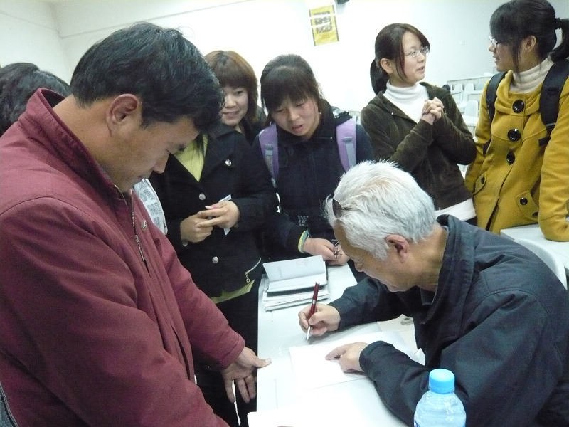 在讲座结束后,许多同学仍然是意犹未尽,教授刚刚走下讲台,同学们便纷纷将教授围了起来,向教授请教。王乃信教授也是平易近人,给每位同学写下励志警言,鼓励同学们继续奋发学习,努力成才!