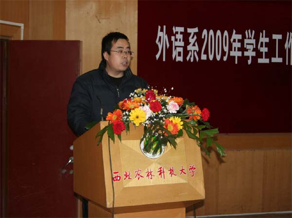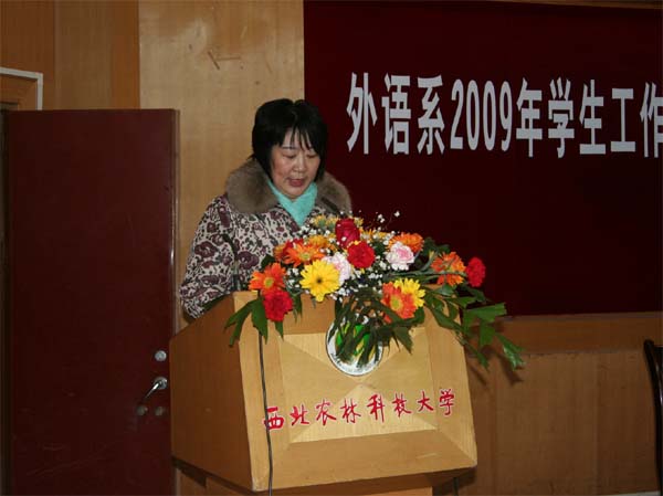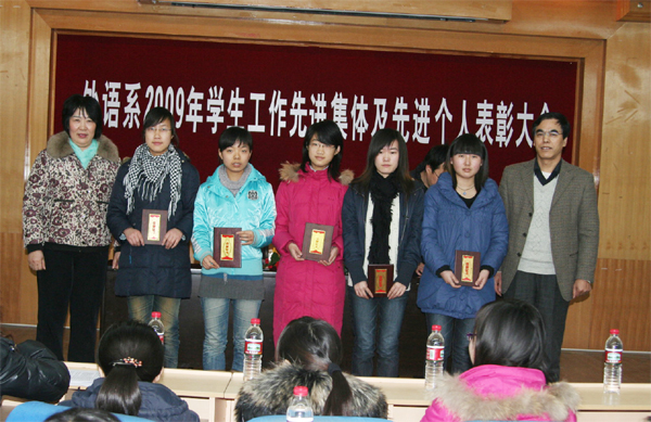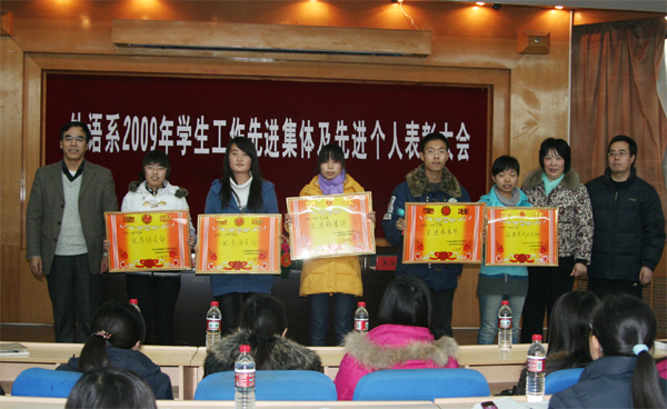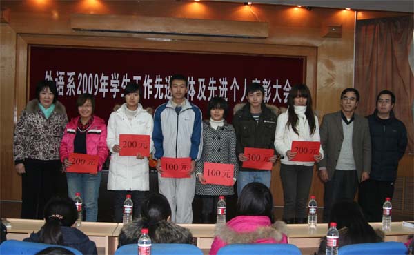 大会在庄严的国歌声中拉开序幕。会上,王小平副书记首先对2009年学生工作进行了详细而全面的总结,充分肯定了过去一年外语系学生工作取得的成绩,提出要继续办好“学长导航”、“经典阅读”等我系的特色活动,并针对进一步加强学风建设等问题提出了要求。随后,窦琴主任宣读了表彰决定。她指出,过去一年来,我系的学生工作取得了显著成绩,广大同学不断从自身做起,综合素质得到了培养和提高,在各类型、各级别的校内外竞赛中获得了优异成绩。在同学们热烈的掌声中,与会领导为获奖的先进集体和先进个人颁发了荣誉证书和奖金。