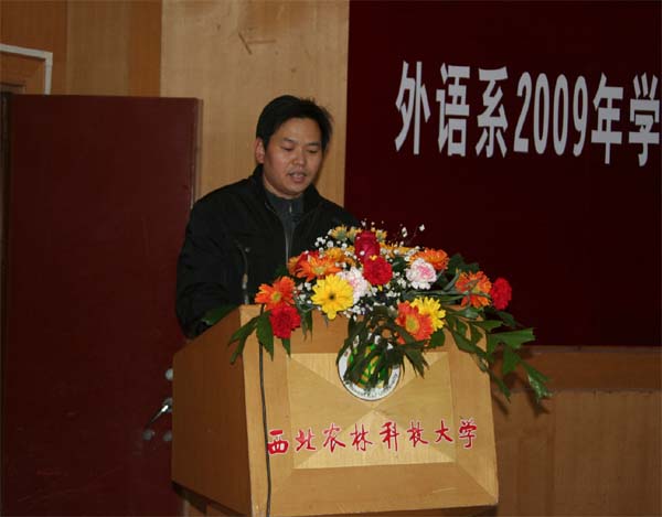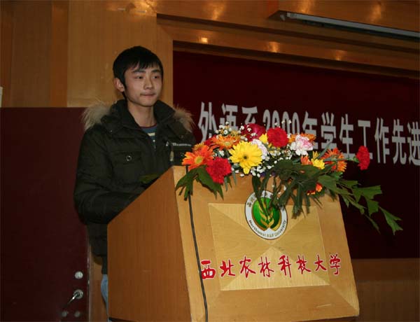 2009年“CCTV杯”全国英语演讲大赛全国优胜奖、“21世纪杯”英语演讲比赛陕西赛区特等奖获得者葛亮同学作为优秀学生代表发言,他说:“大学不仅是求知识,更是求人品,求思考,求能力,求上进。大学为每一个学子提供了一个成长的舞台,同学们要在这里寻找人生的方向,寻找最适合自己的那条路,树立自己的人生观和价值观,最终实现自己的目标。”