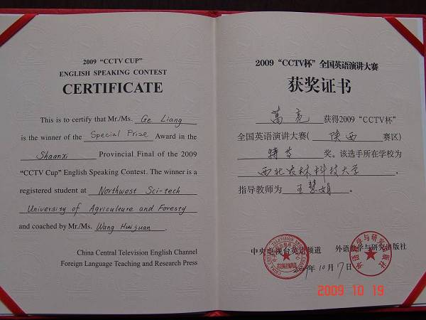 在激烈的比赛中,我系英语专业07级1班学生葛亮同学发挥稳定,表现突出,以优雅的台风,流利的口才,风趣的演讲,标准的英式发音,扎实的英语口语功底,博得了大赛评委的一致好评,荣获本次大赛特等奖。葛亮同学将代表陕西省参加今年11的月在北京举行的“CCTV杯”全国英语演讲大赛半决赛。