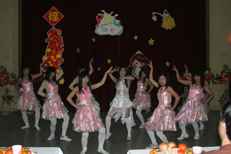 表彰大会结束后,在场师生共同欣赏了精彩纷呈的新年联欢晚会。晚会由火热劲爆的舞蹈《舞娘》拉开帷幕。整个晚会节目形式多样:青春动感的啦啦操表演、深情的流行歌曲对唱、外文歌曲连唱、小品《推销》等赢得了场内观众阵阵掌声,给观众留下了深刻的印象。最后,一曲铿锵有力的合唱《姐妹弟兄》将晚会推向高潮,全体师生一起合拍挥手,晚会在温馨、欢快中落下帷幕。